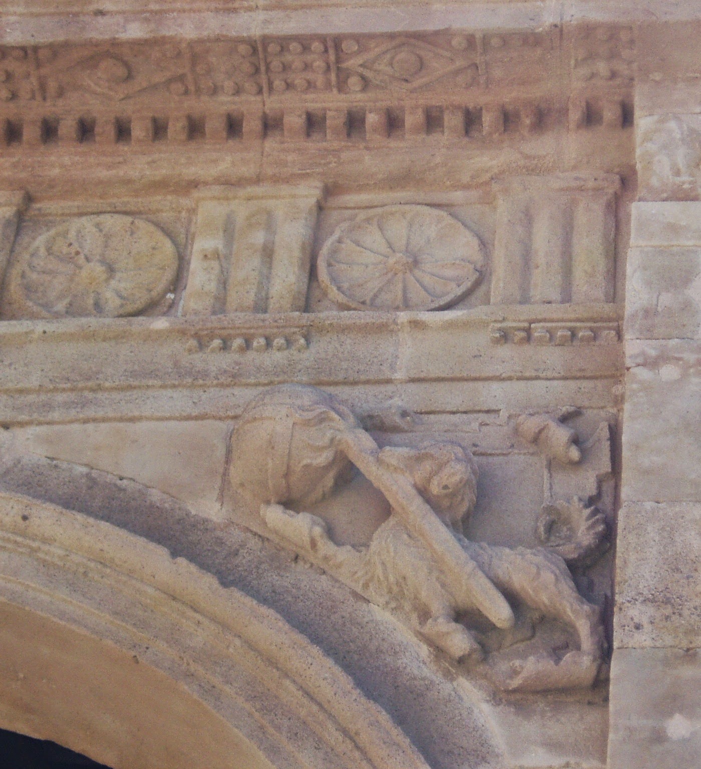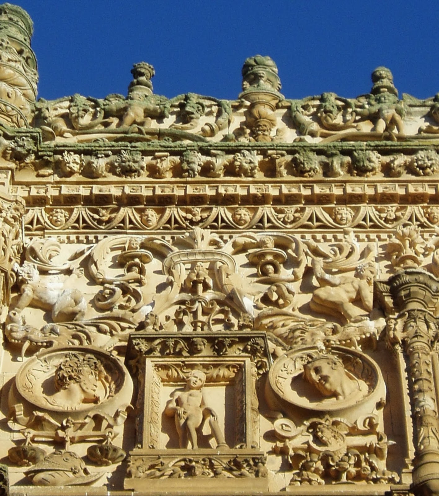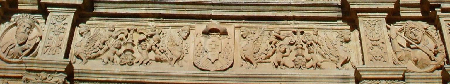 Medallones en las enjutas de los arcos del piso alto, siguiendo el modelo de Fonseca, sin embargo en el piso bajo, las decora con motivos florales barrocos. También se recrea en el Plateresco embelleciendo las Claves de los Arcos con Escudos del Promotor o Cartelas. Es la particular versión y homenaje de Churriguera al singular estilo salmantino del S. XVI.