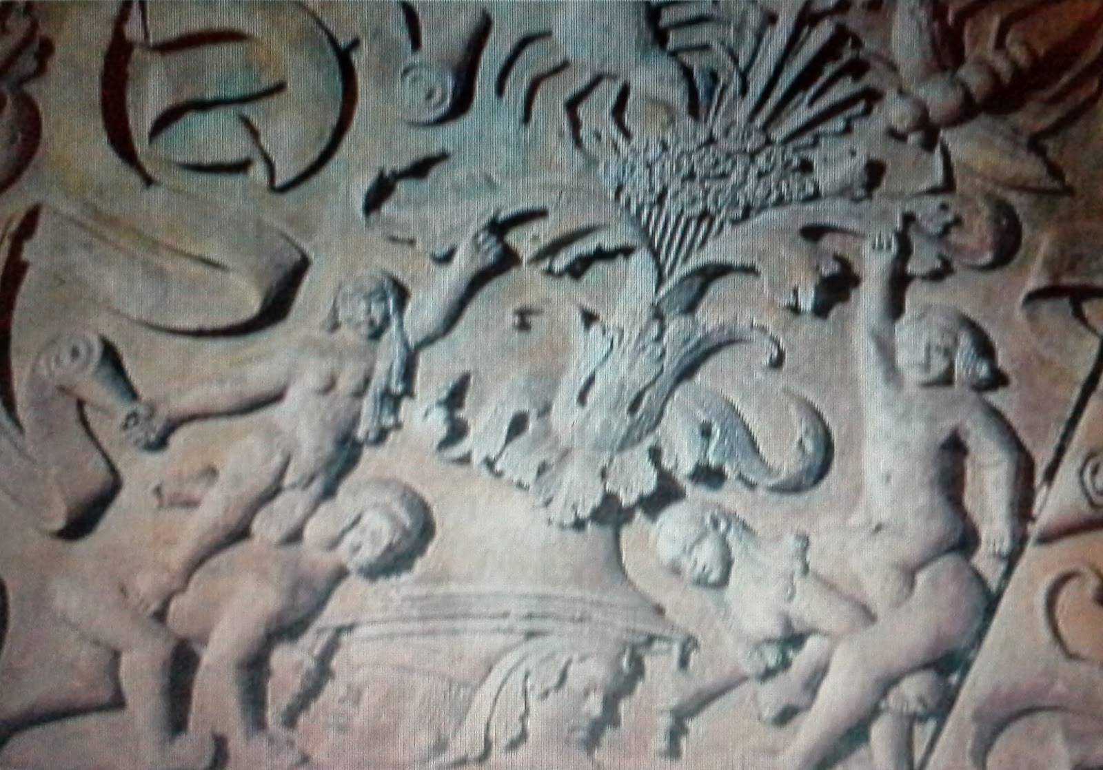 Es en los FRISOS de ambas plantas donde CHURRIGUERA despliega su espléndido Barroquismo, en el superior, Querubines y Máscaras enlazados por Guirnaldas y, en el bajo, un Friso Clásico de Triglifos y Rosetas. Conviene detenerse en cada una de éstas para descubrir su mutación en Máscaras.